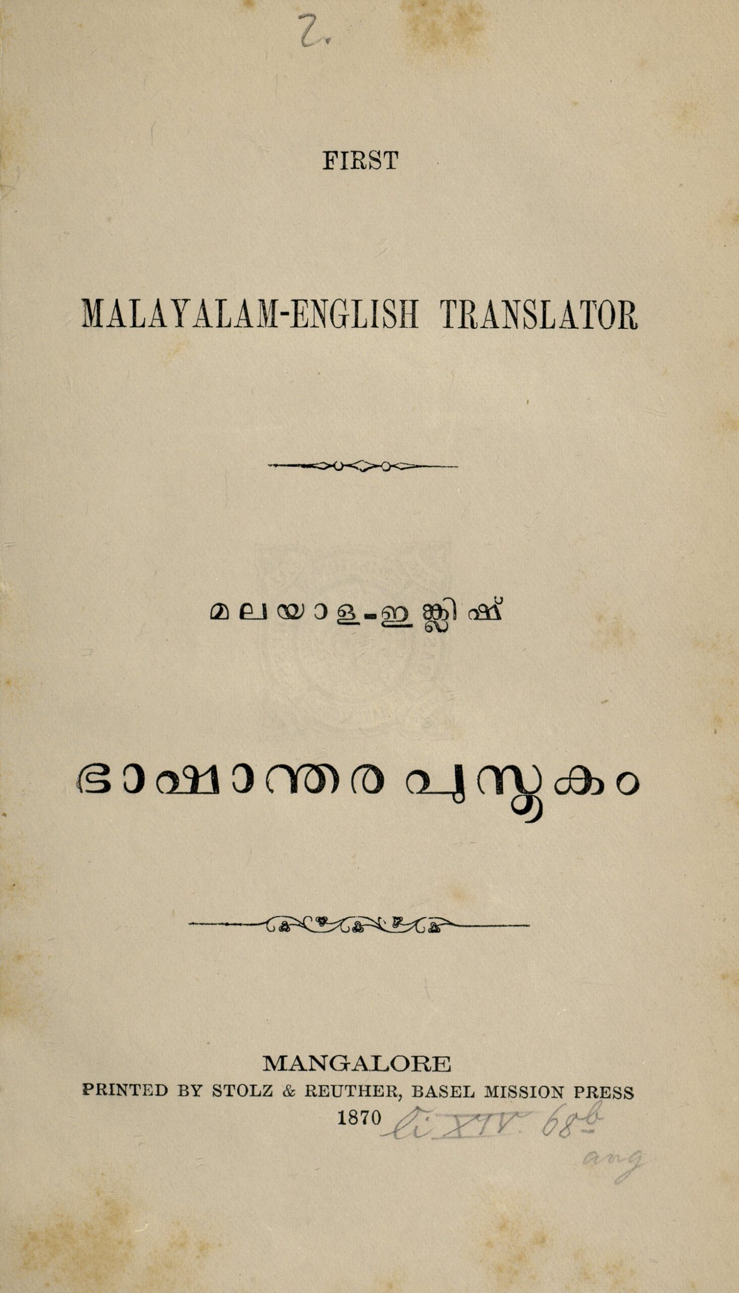 മലയാള-ഇങ്ക്ലിഷ് ഭാഷാന്തര പുസ്തകം എന്ന ഒരു സവിശേഷ പുസ്തകം ആണ് ഈ പോസ്റ്റിലൂടെ പങ്കു വെക്കുന്നത്. ഇത് ട്യൂബിങ്ങൻ സർവ്വകലാശാലയിലെ ഗുണ്ടർട്ട് ശെഖരത്തിലുള്ള ഒരു അച്ചടി പുസ്തകമാണ്. ട്യൂബിങ്ങനിലെ ഗുണ്ടർട്ട് ശേഖരത്തിൽ നിന്നു നമുക്കു ലഭിക്കുന്ന മുപ്പത്തിഒൻപതാമത്തെ പൊതുസഞ്ചയ രേഖ ആണിത്.