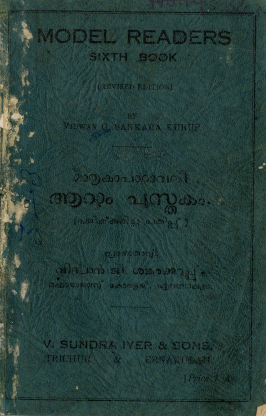 ജി ശങ്കരക്കുറുപ്പിൻ്റെ നേതൃതത്തിൽ പ്രസിദ്ധീകരിച്ച പ്രസിദ്ധീകരിച്ച മാതൃകാപാഠാവലി – ആറാം പുസ്തകം എന്ന മലയാള പാഠപുസ്തകത്തിന്റെ ഡിജിറ്റൽ സ്കാനാണ് ഈ പോസ്റ്റിലൂടെ റിലീസ് ചെയ്യുന്നത്. ആറാം ക്ലാസ്സിലെ ഉപയോഗത്തിനായുള്ള ഈ പാഠപുസ്തകത്തിൽ പ്രസിദ്ധീകരിച്ച വർഷം രേഖപ്പെടുത്തിയിട്ടില്ല. അതിനു പുറമെ ഉള്ളടക്കപ്പട്ടികയിൽ 21മത്തെ പാഠത്തിനു ശേഷമുള്ള പാഠങ്ങൾ പുസ്തകത്തിലെ ഉള്ളടക്കവുമായി യോജിച്ചു പോകുന്നില്ല.
